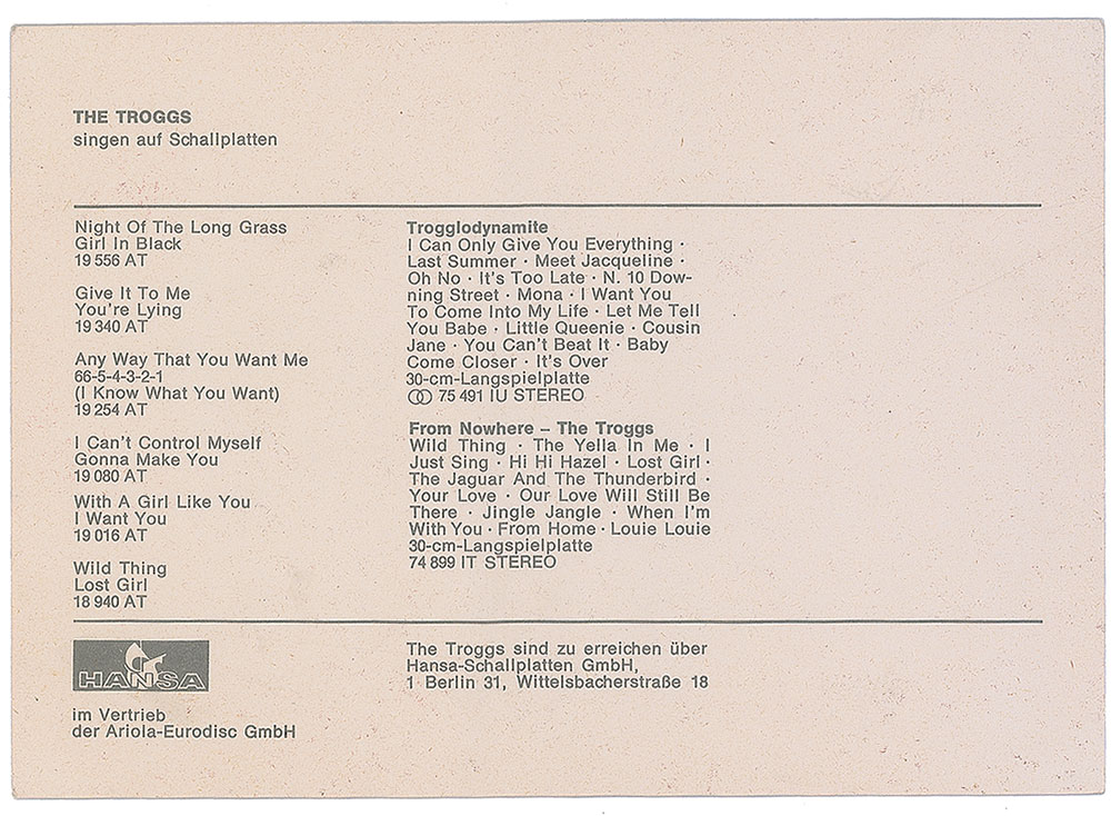 Hansa Records color 4 x 5.75 promo card featuring an image of The Troggs posing inside a cavern, signed on the front in blue ballpoint by Reg Presley, Chris Britton, Pete Staples, and Ronnie Bond; each signing first name only. In fine condition, with moderate contrast to the signatures against the busy background. Pre-certified REAL.