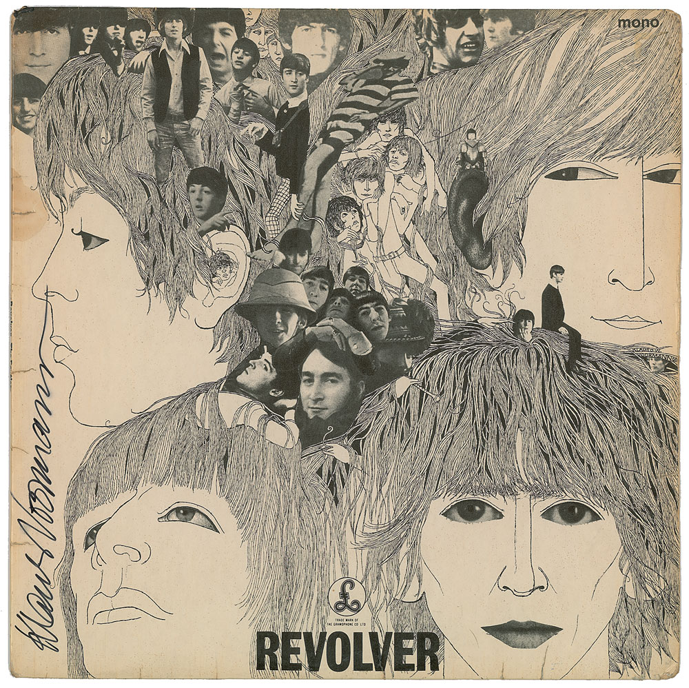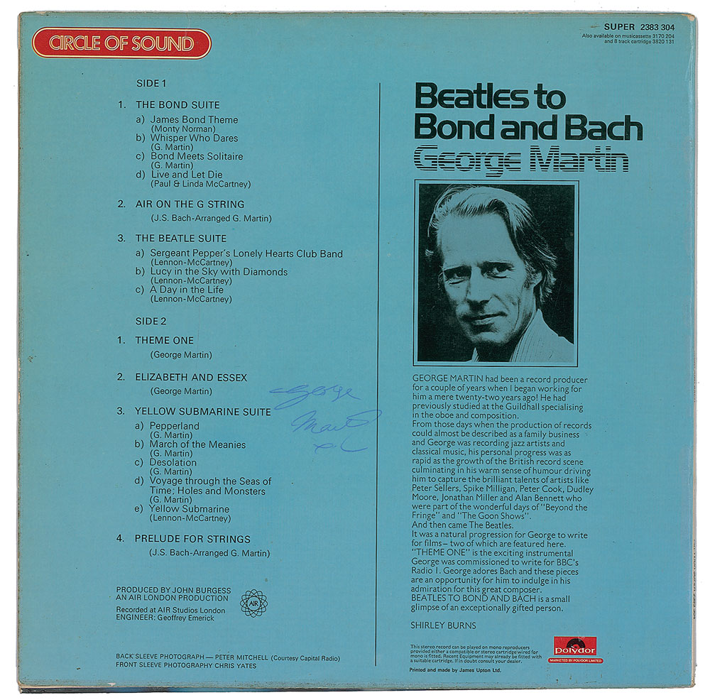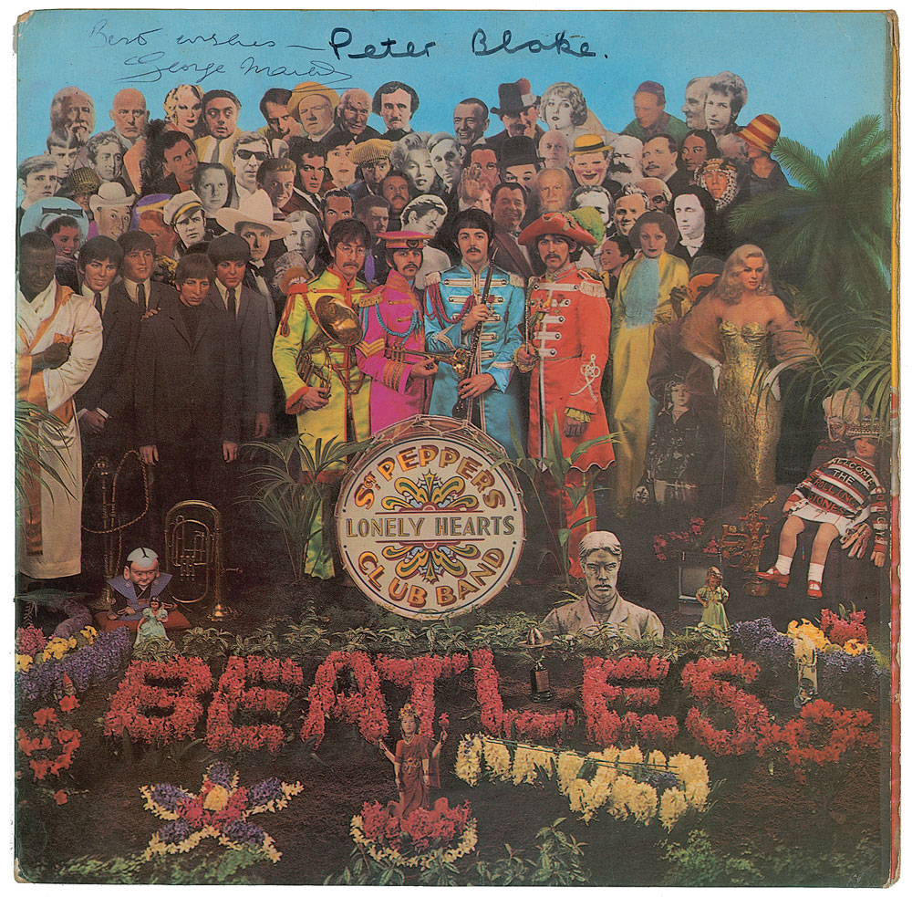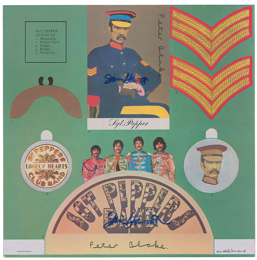 Four items: a Revolver album signed vertically on the front cover by Klaus Voormann, a German artist, musician, and record producer who designed the Revolver cover art; a color 12.25 x 12.25 cut-out sheet for The Beatles' Sgt. Pepper's Lonely Hearts Club Band album, signed twice in blue and black felt tip by both Jann Haworth and Peter Blake, a pair of pop artists who designed the cover art for the Sgt. Peppers record; a Sgt. Pepper's Lonely Hearts Club Band album, signed along the top in black ballpoint by the album’s producer George Martin, and in black felt tip by Blake; and a Beatles to Bond and Bach album, signed on the back cover in blue ballpoint by Martin. Edgewear and creases with a few spots of dampstaining to Revolver album, otherwise fine condition; the other items are in overall fine condition, with scattered creases and edgewear to albums. The records are included. A great grouping of influential Beatles artists. Pre-certified REAL.