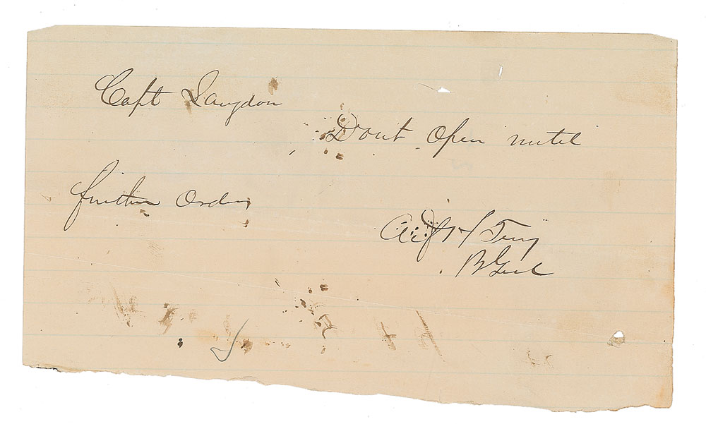 Union general (1827–1890) who fought at First Bull Run and Port Royale, and who, after the war, became commander of the expedition against the Sioux during which Custer met his end at Little Bighorn. ANS signed “Alfd. H. Terry, B. Genl,” one page, 7.5 x 4.5, no date. Presumed battlefield note hastily dashed off to Captain Loomis L. Langdon. In full: “Don’t open until further orders.” Moderate creases, toning, a few small holes, mirroring of ink, and several stray ink marks, otherwise fine condition. Pre-certified PSA/DNA.