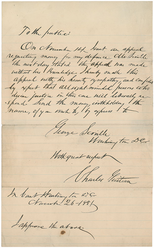 ADS, one page, lightly-lined, 7.5 x 12.25, November 26, 1881. Letter addressed “To the Public” in which Guiteau seeks to raise the necessary money to fund his defense. In full: “On November 14—I sent an appeal requesting money for my defence. Mr. Scoville the next day stated the appeal was made without his knowledge. I hereby make this appeal with his hearty sympathy, and confidently expect that all right-minded persons who desire justice in this case will liberally respond. Send the money, withholding the name, if you wish to, by express to George Scoville, Washington D.C.” Partial separations to expected mailing folds, slight creasing and soiling, and a blot of ink near the bottom edge, otherwise fine condition.