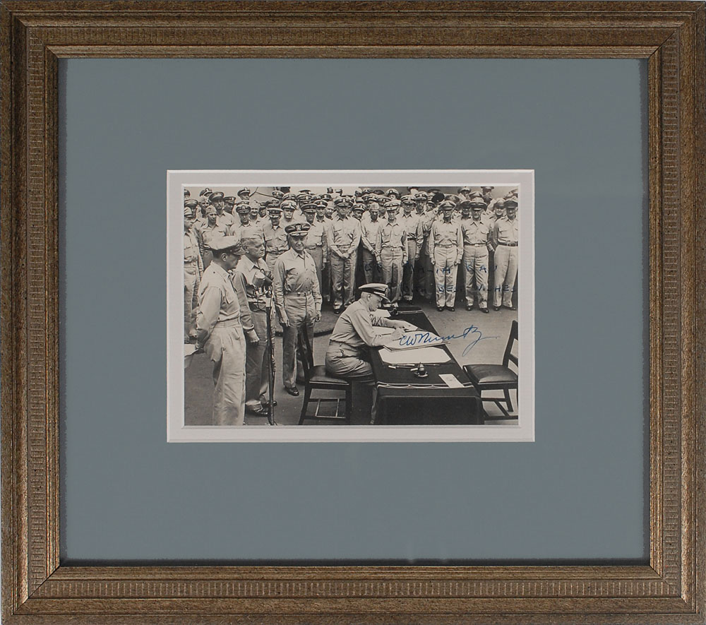 Highly sought-after matte-finish 6 x 4.25 photo of Nimitz signing the Japanese surrender aboard the USS Missouri, signed and inscribed in blue fountain pen, “For Malia Kau, with best wishes, C. W. Nimitz.” Archivally double-matted and framed to an overall size of 12.75 x 11.25. In fine condition. Pre-certified PSA/DNA.