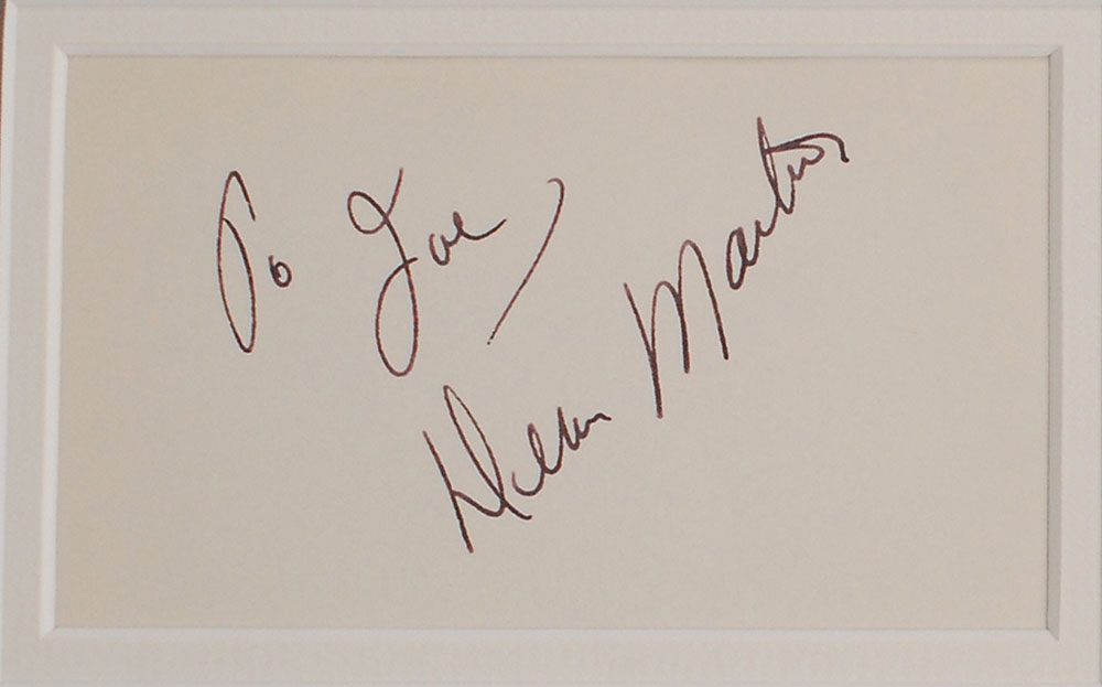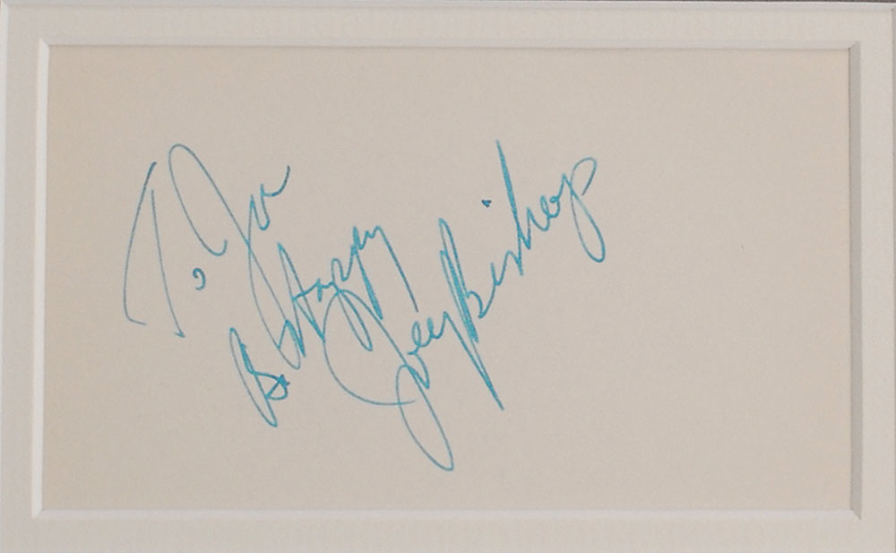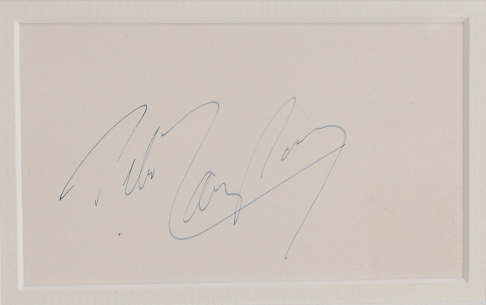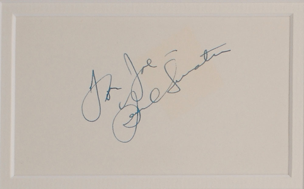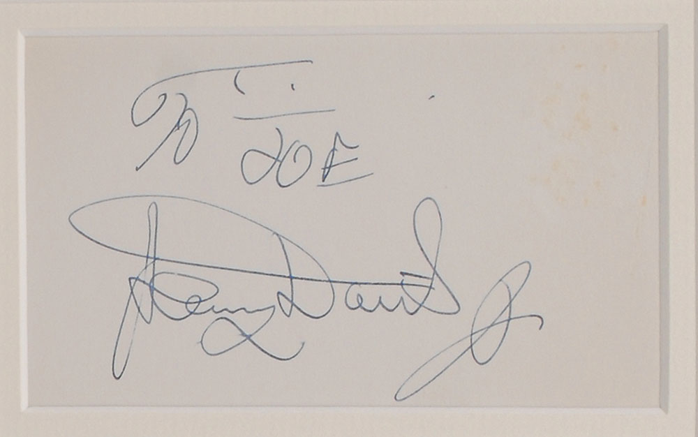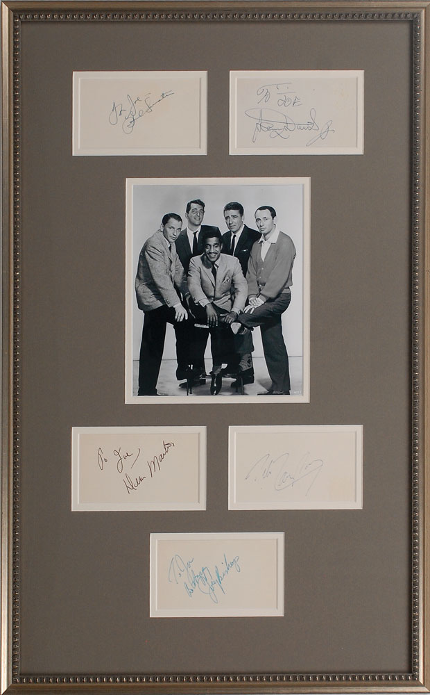 Fabulous collection of five ink signatures of the Rat Pack on individual off-white 5 x 3 cards, including Frank Sinatra, Sammy Davis, Jr., Dean Martin, Peter Lawford, and Joey Bishop, with all but Lawford inscribed to “Joe.” Expertly double-matted and framed with a portrait of the entertainers to an overall size of 17 x 27.5. In overall fine condition. A handsome display of choice in-person signatures. Pre-certified PSA/DNA.