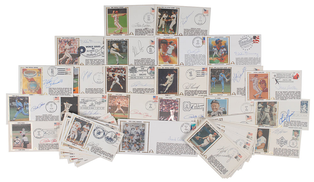 Collection of sixty Gateway covers with silk cachets honoring a variety of players and events, each signed in ballpoint or felt tip by a notable baseball player, including: Rod Carew, Steve Carlton (2), Goose Gossage, Rickey Henderson, Orel Hershiser, Bo Jackson, Fred Lynn, Eddie Murray (2), Jim Rice, Cal Ripken, Jr., Pete Rose (5), Nolan Ryan, Mike Schmidt (2), Joaquin Andujar, Mike Caldwell, Jose Canseco, Ron Cey, Larry Christenson, Frank Crosetti, John Denny, Lenny Dykstra, Steve Garvey, Kirk Gibson, Dwight Gooden, Mudcat Grant, Mickey Hatcher (2), Keith Hernandez, Willie Hernandez, Bruce Hurst, Wally Joyner, Ron Kittle, Ray Knight, Lee Mazzilli, Graig Nettles, Jerry Reuss, Jose Rijo, Jim Slaton, Dave Stieb, John Tudor, Frank Viola, Matt Williams (2), Willie Wilson, and nine others. In overall fine condition, with haloing to a few of the signatures.
