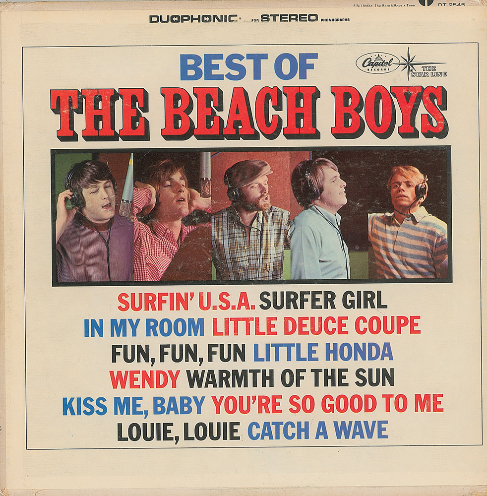 Best of the Beach Boys Vol. 1 album signed on the back cover in ballpoint and felt tip by Brian Wilson, Dennis Wilson, Carl Wilson, Mike Love, Bruce Johnston, Al Jardine, David Marks, and Glen Campbell. Light scattered toning and soiling, edgewear, and a label remnant to the left edge of the back cover, otherwise fine condition. The record is included. Pre-certified REAL.