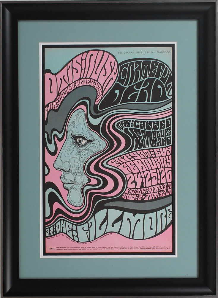 Original color first printing 13.5 x 21.5 poster for the shows by the Grateful Dead, Otis Rush, and Canned Heat at the Fillmore, San Francisco, February 24–26, 1967, featuring iconic psychedelic artwork by Wes Wilson. Catalog designation BG-51-OP-1. Archivally triple-matted and custom-framed with UV-resistant museum glass to an overall size of 23 x 31. This 51st image in the Bill Graham Fillmore series retains its beautifully bright and clear colors, and is an extremely rare and desirable example as the blue and pink inks used in its production were prone to fading over time. In very fine condition. Oversized.