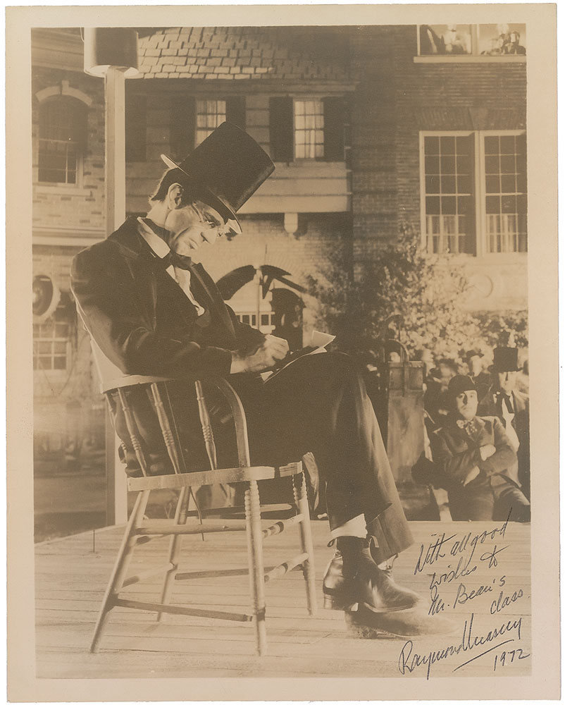 Two items: a program for a 1939 performance of Robert E. Sherwood’s Abe Lincoln in Illinois, 8.75 x 12, 12 pages, signed on the front cover in fountain pen; and a matte-finish 8 x 10 photo of Massey on stage as Lincoln, signed and inscribed in black ballpoint, “With all good wishes to Mr. Bean’s class, Raymond Massey, 1972.” In overall fine condition, with slight creasing to left edge and scattered rubbing and light soiling to covers of the program. Accompanied by an unsigned broadside for the play, promoting its two-week run beginning on October 23, 1939. Massey earned a Best Actor Oscar nomination for his reprisal of the role in John Cromwell’s 1940 film adaptation. Pre-certified PSA/DNA.
