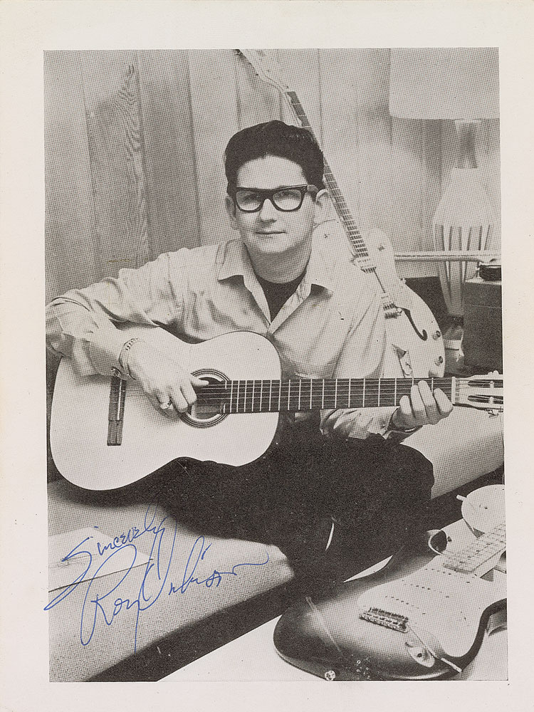 Superb 6 x 8 cardstock photo of Orbison playing his guitar in his thick-rimmed glasses, boldly signed in blue ballpoint, “Sincerely, Roy Orbison.” In fine condition. Pre-certified REAL.