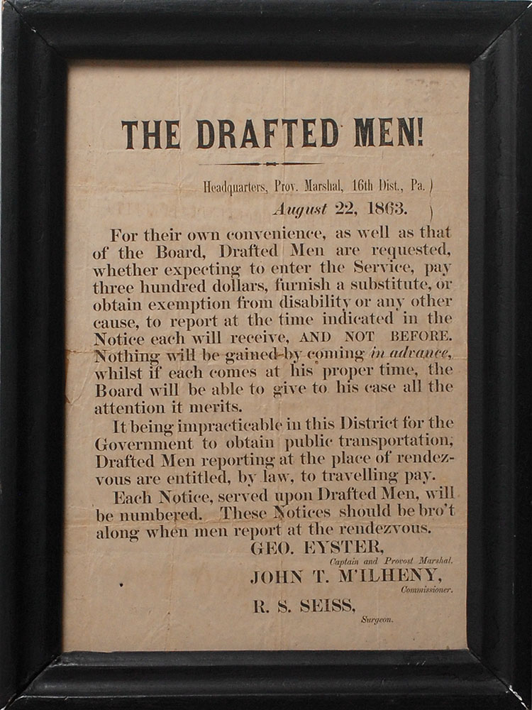 Civil War–dated printed draft notice issued from the Pennsylvania Provost Marshal’s office, one page, 6.5 x 9.5, August 22, 1863. Broadside headed “The Drafted Men!,” in part: “For their own convenience, as well as that of the Board, Drafted Men are requested, whether expecting to enter the Service, pay three hundred dollars, furnish a substitute, or obtain exemption from disability or any other cause, to report at the time indicated in the Notice each will receive, and not before. Nothing will be gained by coming in advance.” Framed to an overall size of 8.75 x 11.75. In very good condition, with intersecting folds, overall toning, and chipping to edges.