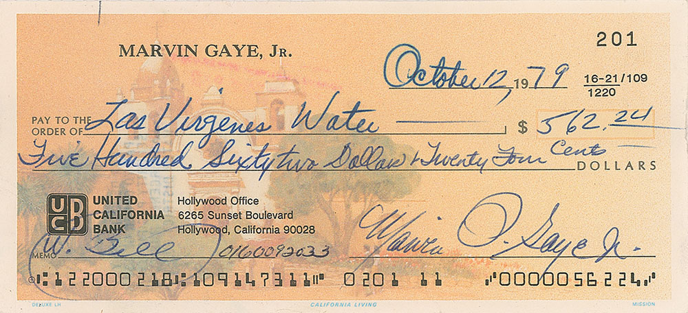 Personal check, 6 x 2.75, filled out and signed by Gaye, “Marvin P. Gaye, Jr.,” payable to Las Virgenes Water for $562.24, October 12, 1979. In fine condition. Pre-certified REAL.