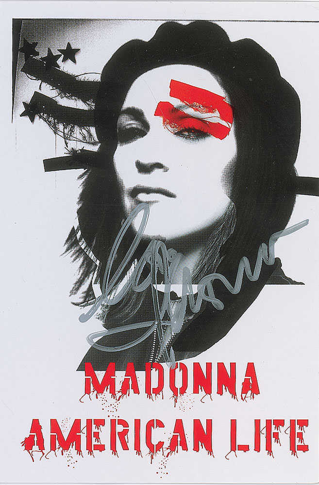 Color 4 x 6 postcard photo promoting her 2003 album American Life, signed in silver ink, “Love, Madonna.” In fine condition. Pre-certified PSA/DNA.