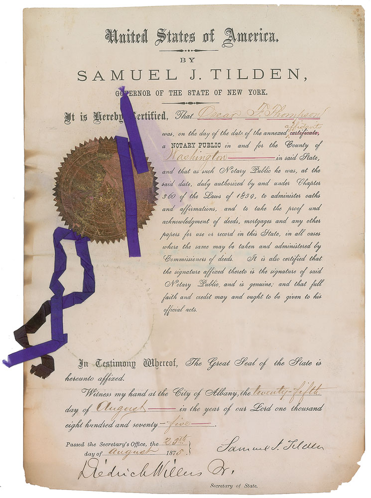 American statesman (1814–1886) who served as governor of New York and was the unsuccessful Democratic presidential candidate in the infamous disputed election of 1876. Partly-printed DS, one page, 8 x 11.5, August 25, 1875. As governor of New York, Tilden certifies Oscar F. Thompson as “Notary Public in and for the County of Washington.” Crisply signed at the conclusion by Governor Tilden and countersigned by Secretary of State of New York Diedrich Willers, Jr. The affixed gold seal and purple ribbons remain intact with rubbing to the gilt foil of the seal. In very good condition, with scattered toning, soiling and chipping to edges, and some bands of discoloration from the purple ribbons. Pre-certified PSA/DNA.