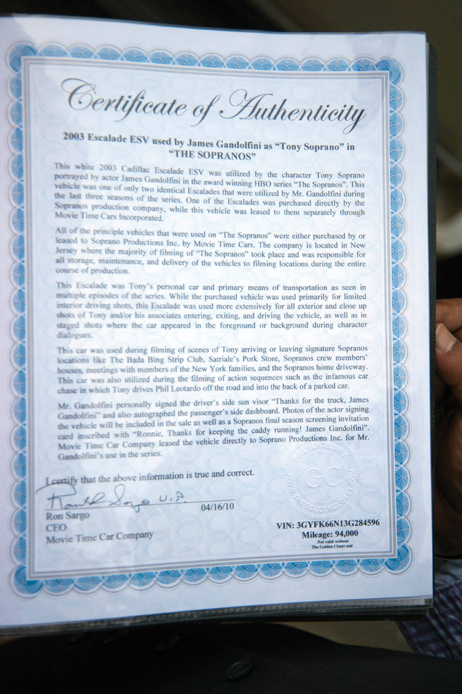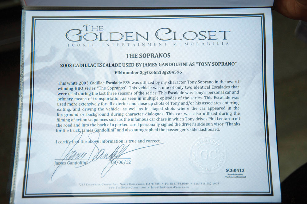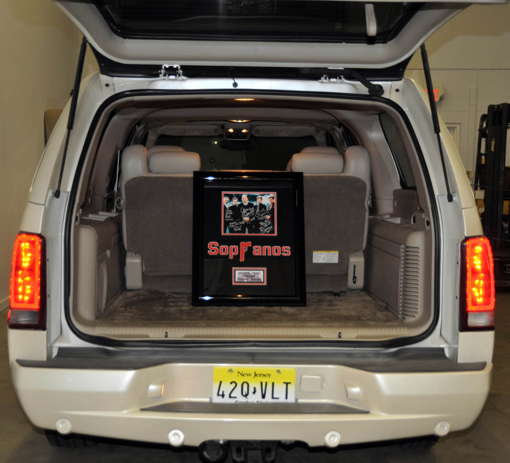 The VIN number of the vehicle is 3GYFK66N13G284596 and the New Jersey license plate number is “42QVLT.” The car was leased directly to the production by Movie Time Cars Incorporated; the principal vehicles that were used on The Sopranos were either purchased by or leased to Soprano Productions Inc. by Movie Time Cars in New Jersey. The company was responsible for all storage, maintenance, and delivery of vehicles to filming locations during the entire course of production. The second Escalade, which was purchased directly by the production company, was mostly used for limited interior driving shots. Since being purchased at auction with just under 100,000 miles on it, the here-offered, extensively screen-used Escalade remains in great working condition and has only 108,969 total miles today. The vehicle has been safely stored in a temperature-controlled warehouse, with the engine being started weekly to maintain its performance. Car is accompanied by an official prop license for Gandolfini’s character, Anthony Soprano, and a framed photograph signed by five Sopranos cast members, including Gandolfini. Bidding note: the vehicle is currently stored in Vancouver, Canada, and the buyer is responsible all shipping costs. RR Auction will help facilitate the relocation of this vehicle. Please email