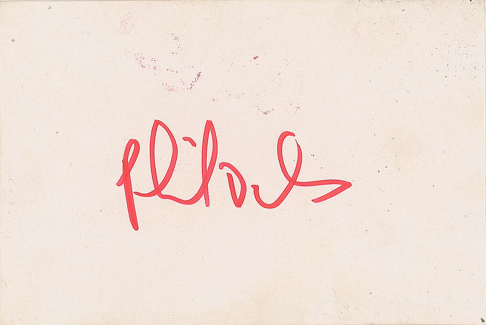 American protest or topical singer and songwriter (1940–1976) known for his wit, political activism, and distinctive voice. He eventually succumbed to a number of problems including bipolar disorder and alcoholism, and took his own life in 1976. Red felt tip signature, “Phil Ochs,” on an off-white 4.75 x 3 slip. Staple holes to upper left corner, and light scattered ink marks and toning, otherwise fine condition. Pre-certified REAL.