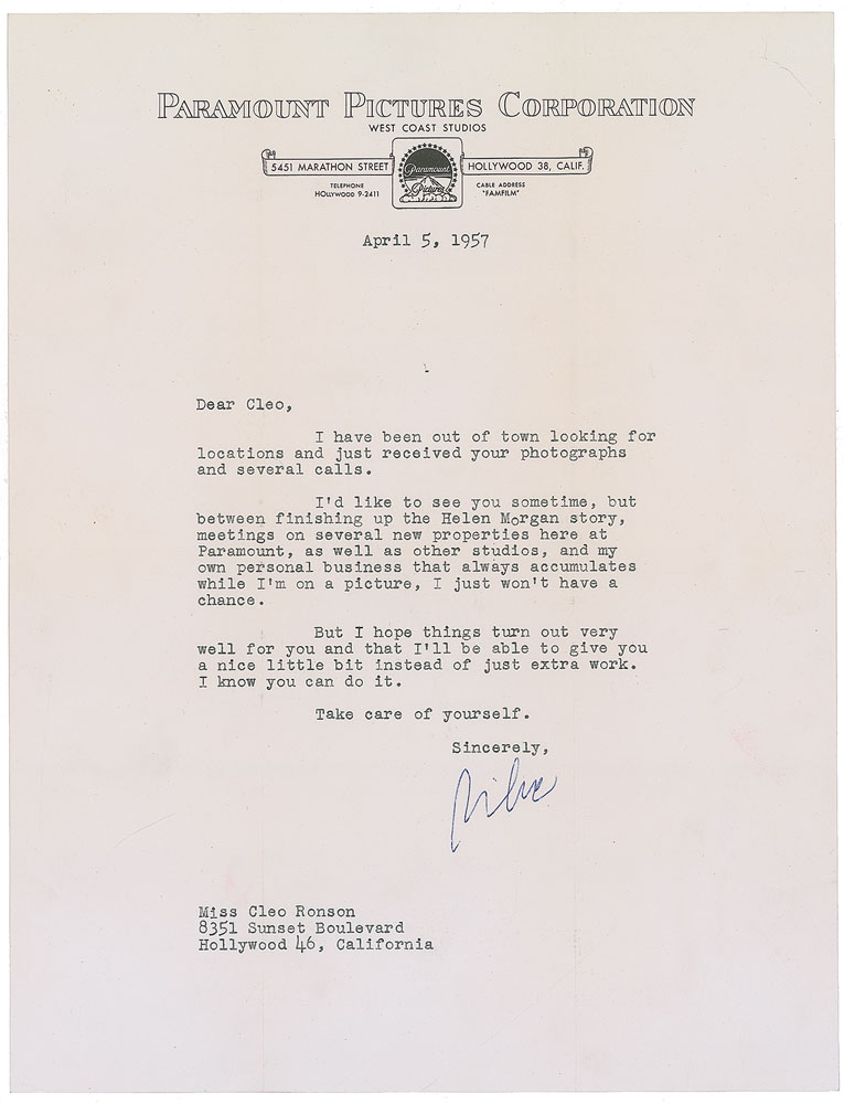 Distinguished Hungarian-born American film director (1886–1962) who helmed such all-time classics as Casablanca, Angels with Dirty Faces, Yankee Doodle Dandy, and White Christmas. TLS signed “Mike,” one page, 8.5 x 11, Paramount Pictures Corporation letterhead, April 5, 1957. Letter to Miss Cleo Ronson, in full: “I have been out of town looking for locations and just received your photographs and several calls. I’d like to see you sometime, but between finishing up the Helen Morgan story, meetings on several new properties here at Paramount, as well as other studios, and my own personal business that always accumulates while I’m on a picture, I just won’t have a chance. But I hope things turn out very well for you and that I’ll be able to give you a nice little bit instead of just extra work. I know you can do it.” In fine condition, with intersecting folds. Pre-certified PSA/DNA.