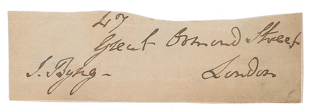 Royal Navy officer (1704–1757) whose loss of Minorca at the beginning of the Seven Years’ War led to his execution. Rare ink signature, “J. Byng,” on an off-white 4.75 x 1.5 slip clipped from an address panel and affixed to a same-size card. In fine condition, with uniform toning and irregularly trimmed edges. Pre-certified PSA/DNA.