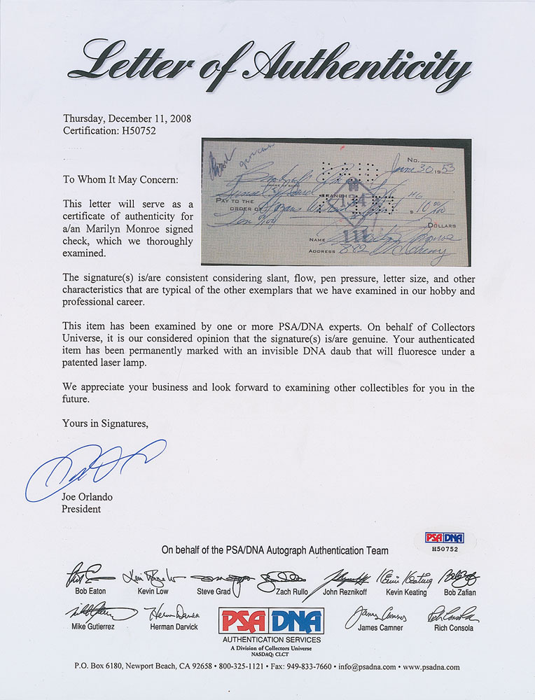 Sought-after bank check, 6 x 2.75, filled out and signed by Monroe, payable to Hazan’s Westside Market for $10, June 30, 1953. In fine condition, with expected bank stamps and cancellation holes (stamps affecting a portion of her first name). Accompanied by a full letter of authenticity from PSA/DNA. Located on Sunset Boulevard, Hazan’s Westside Market catered to the film studios and Hollywood elite of the 1950s. A desirable example filled out entirely in Monroe’s hand from the period that saw her emergence as a bona fide superstar.