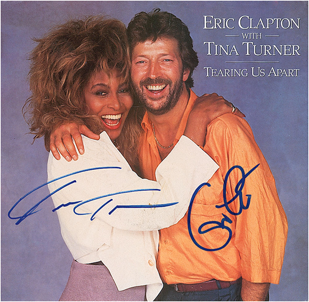 Color 45 rpm record sleeve for the 1987 single ‘Tearing Us Apart,’ signed in blue felt tip by Eric Clapton and Tina Turner. In fine condition, with trivial creasing to top edge. Pre-certified REAL.