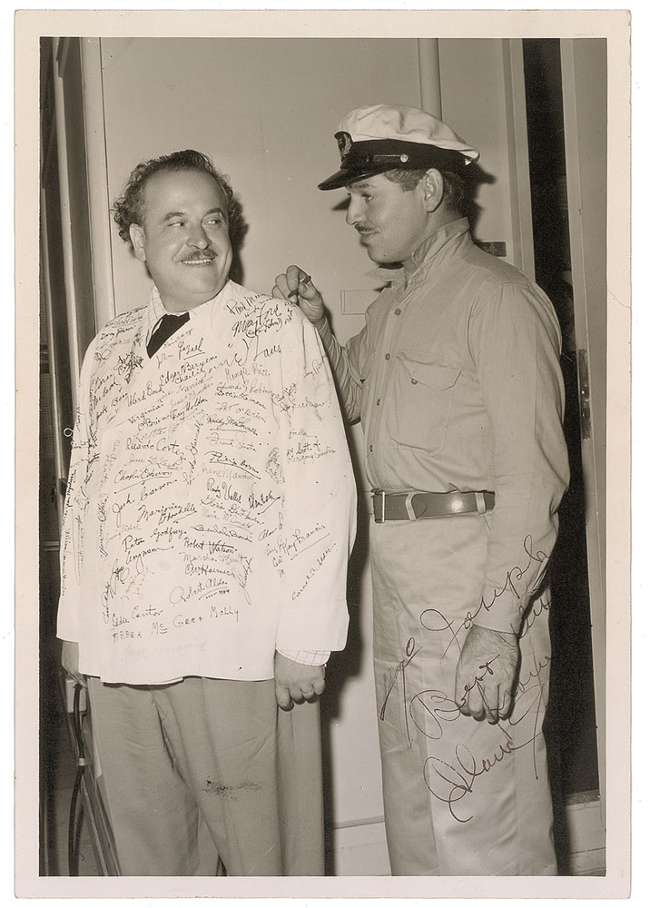 Vintage textured matte-finish 7 x 10 photo of Gable in a military uniform signing the shoulder of a man’s autograph-filled coat, signed and inscribed in fountain pen, “To Joseph, Best Wishes, Clark G—.” A stray ink mark, slight edgewear, and a diagonal crease extending into the back of Gable’s head, otherwise fine condition. Pre-certified PSA/DNA.