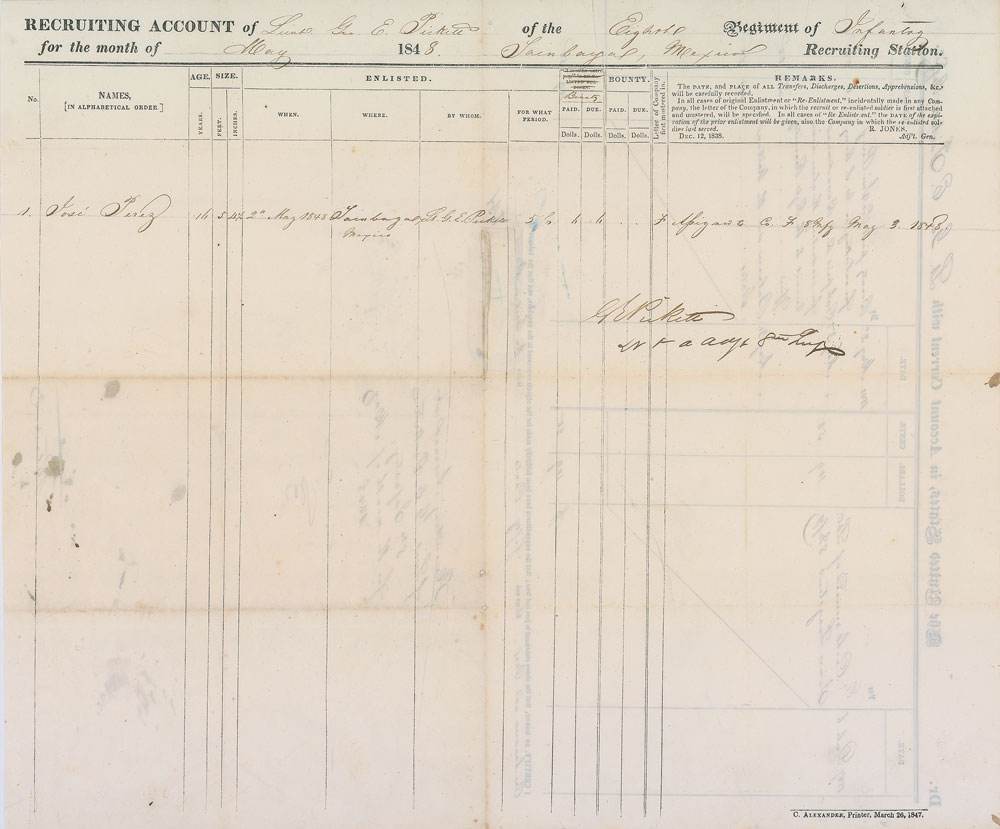 Partly-printed DS, signed “G. E. Pickett. Lt & r Adjt 8th Infy,” one page, 15 x 12.5, May 1848. Document headed “Recruiting Account of Lieut. Geo. E. Pickett of the Eighth Regiment of Infantry for the month of May 1848 Tacubaya, Mexico Recruiting Station.” The document lists a new soldier recruited by the 23-year-old Pickett, “Jose Perez,” enlisted for a period of “5 Yrs,” and “Assigned to Co. F 8 Infy May 3, 1848.” Pickett boldly signs below. An account table on the reverse reads: “Cash received of Lt. James Longstreet Dollars 109 Cents 50,” which includes the “Bounty paid Pvt Jose Perez for enlisting in U.S. Army.” Intersecting folds, an area of repaired paper loss to a column left of Pickett’s signature, and a few stray ink spots, otherwise fine condition.