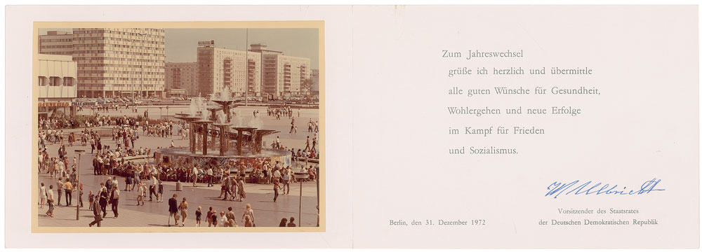 German communist politician (1893–1973) who led East Germany from 1960 until his death. New Year’s card sent to celebrate the beginning of 1973, measuring 8.25 x 5.75 closed, featuring an affixed photo and printed message in German inside, signed below in blue fountain pen, “W. Ulbricht.” In fine condition. Pre-certified PSA/DNA.