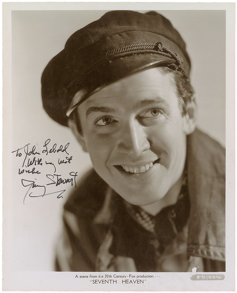 Glossy 8 x 10 20th Century Fox publicity photo of Stewart as Chico from the 1937 film Seventh Heaven, signed and inscribed in black felt tip, “To John Lebold, with very best wishes, Jimmy Stewart.” Reverse bears two ownership stamps. Slight scattered surface impressions and creases, a small tear to right edge, a small area of surface loss near lower border, and slight smudging near the inscription, otherwise fine condition. Pre-certified PSA/DNA.