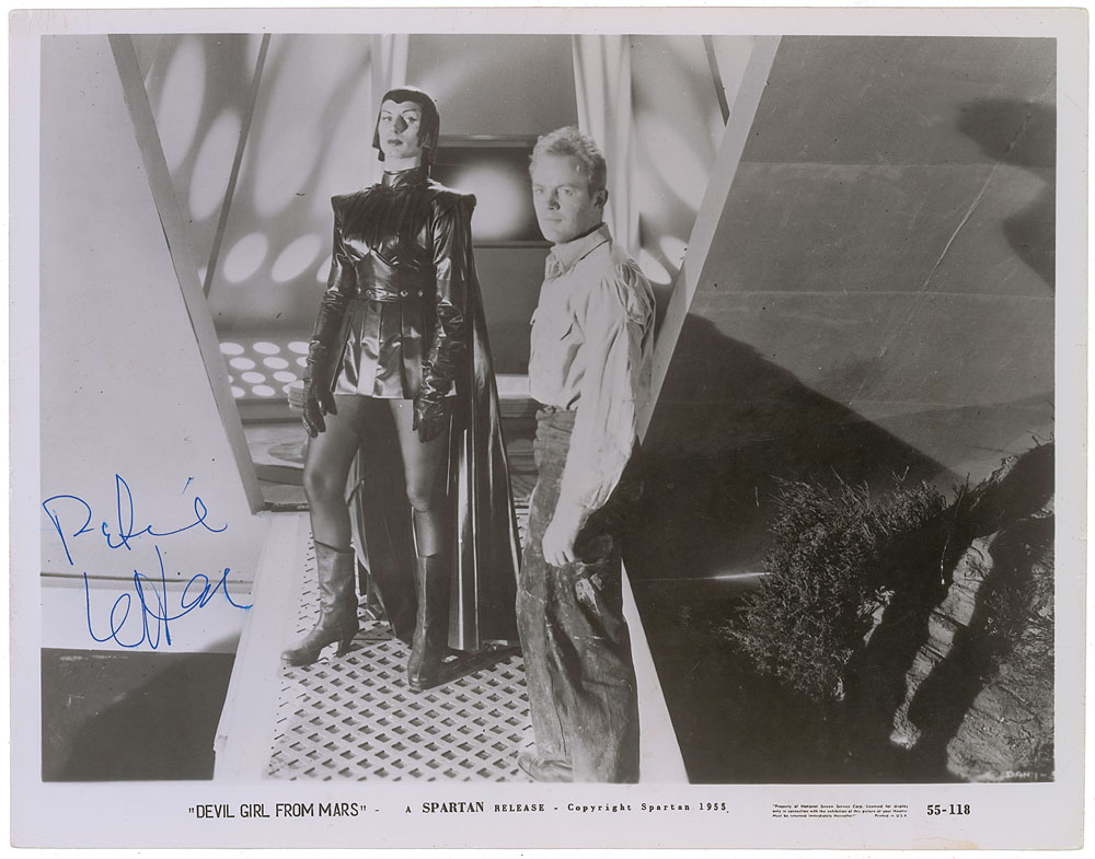 British actress (born 1919) best known for her role in Devil Girl from Mars, one of the first films of its genre produced in the UK. Glossy 10.25 x 8 Spartan publicity photo of Laffan as Nyah in the 1954 film Devil Girl from Mars, signed in blue ink. Slight scattered surface impressions and creasing, and two small tears to right edge, otherwise fine condition. Pre-certified PSA/DNA.