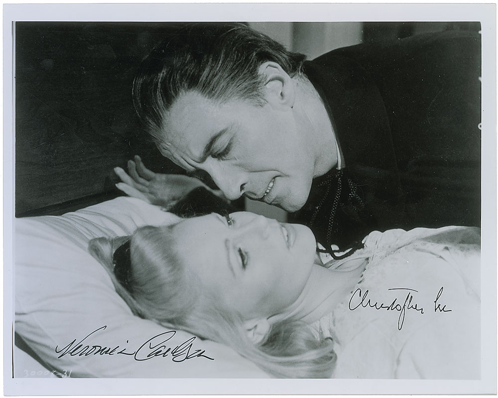 Glossy 10 x 8 photo of Christopher Lee and Veronica Carlson from the 1968 film Dracula Has Risen from the Grave, signed in black ink by Lee, and in black felt tip by Carlson. In fine condition. Pre-certified PSA/DNA.
