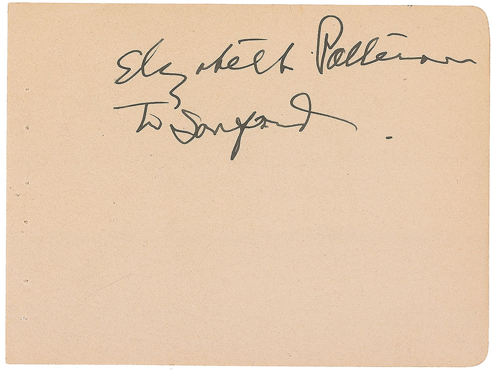 American character actress (1875–1966) best-known for her role as the elderly neighbor Matilda Trumbull on I Love Lucy. Ink signature, “Elizabeth Patterson, To Sanford,” on an off-white 6 x 4.5 album page. In fine condition. Pre-certified PSA/DNA.
