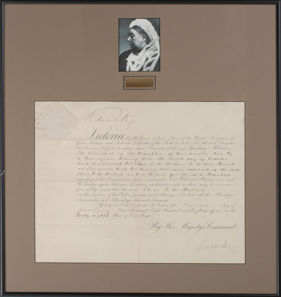 Partly-printed DS, signed “Victoria R,” one page, 15.25 x 11.75, January 12, 1885. Queen Victoria informs the President of Guatemala of the appointment of “Elias J. de Bulnes to be Vice-Consul at Liverpool.” The white paper seal affixed adjacent to the signature remains intact. Matted and framed with an image and nameplate to an overall size of 20.5 x 22. In fine condition, with intersecting folds and trivial soiling. Pre-certified PSA/DNA.