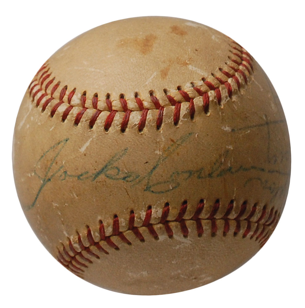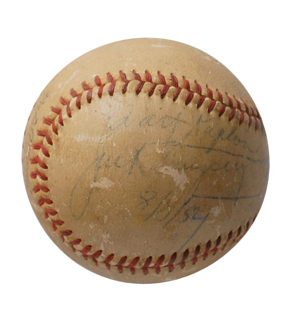 Official Spalding National League (Giles) baseball signed and inscribed on a side panel in ballpoint, “To Art Kaplan, Jack Dempsey, 8/8/54,” and on the sweet spot, “Jocko Conlan.” In very good condition, with a light shellac coating, scattered chipping and surface loss (affecting a couple letters in Dempsey’s signature), and a few stains to side panels. An unusual format for this combination of boxing and baseball greats. Pre-certified PSA/DNA.
