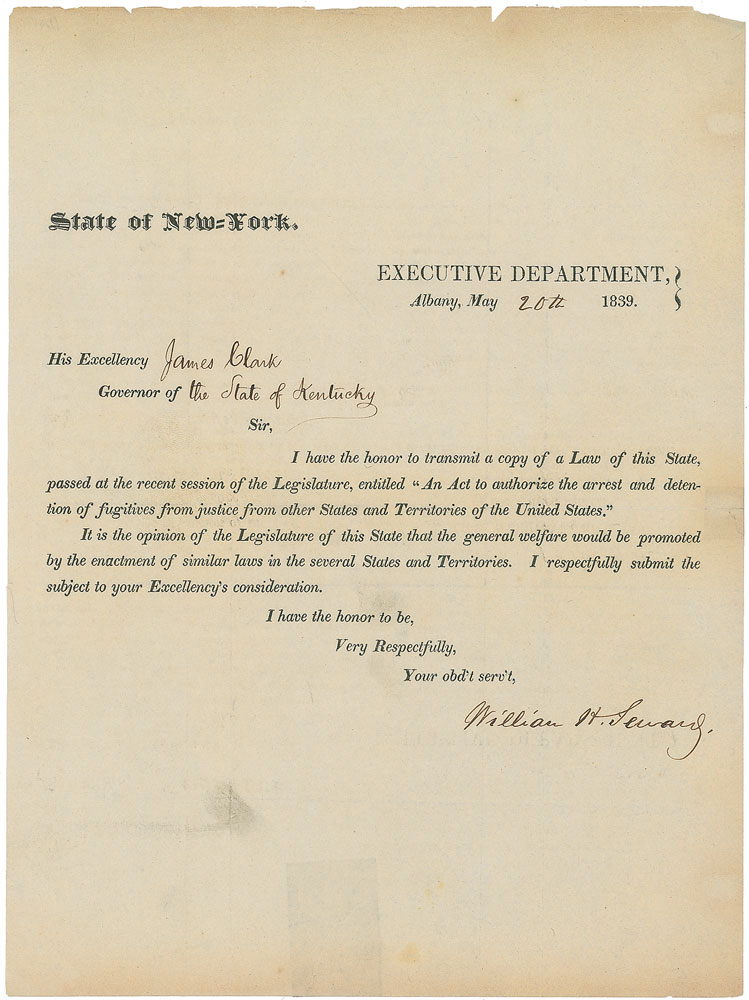 American statesman (1801–1872) who served as secretary of state in the Lincoln administration. Printed circular letter signed by Seward as governor, one page, 8.25 x 11, State of New York Executive Department letterhead, May 20, 1839. Letter to Governor James Clark of Kentucky. In part: “I have the honor to transmit a copy of a Law of this State, passed at the recent session of the Legislature, entitled ‘An Act to authorize the arrest and detention of fugitives from justice from other States and Territories of the United States.’ It is the opinion of the Legislature of this State that the general welfare would be promoted by the enactment of similar laws in the several States and Territories.” Intersecting folds (one vertical fold passing through a single letter of the signature), toning and a few tears to edges, and light soiling, otherwise fine condition. Accompanied by an unsigned engraved portrait. Pre-certified PSA/DNA.