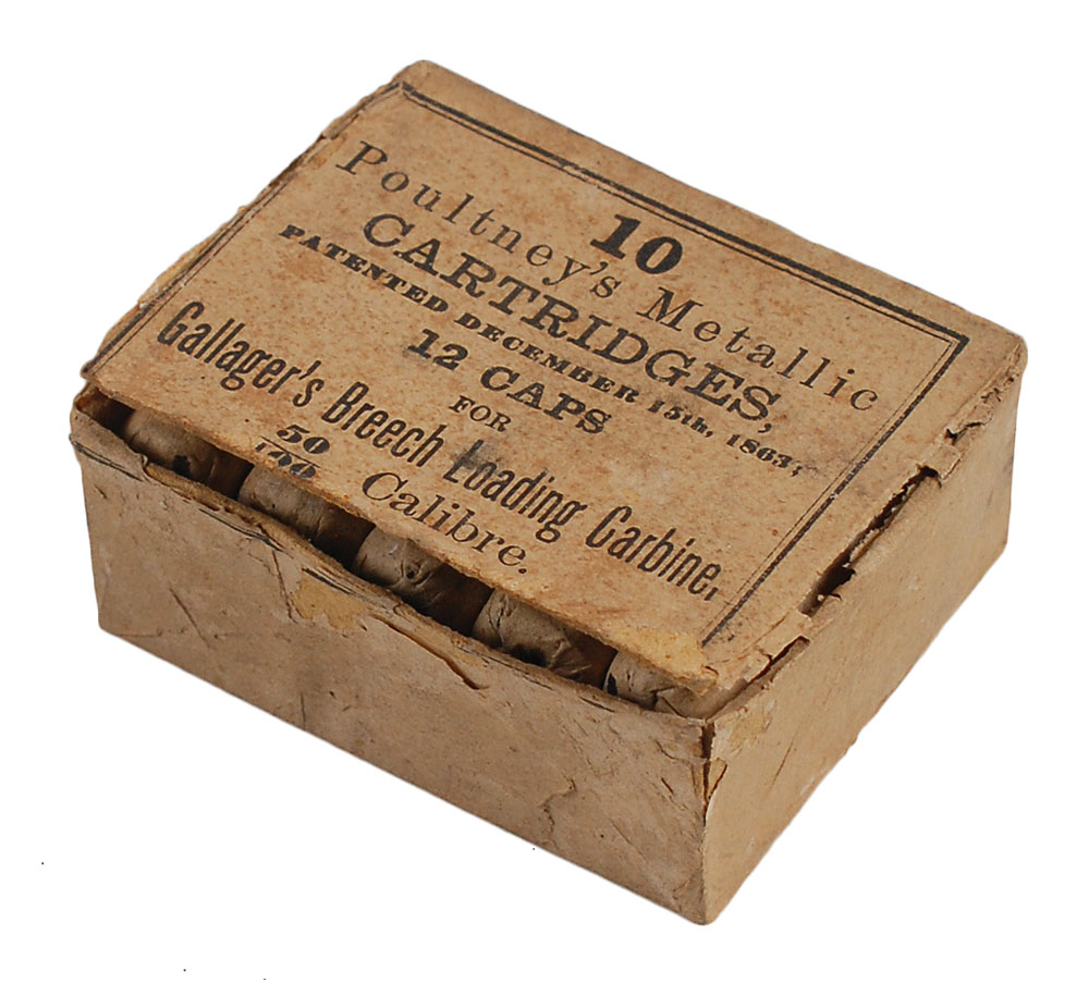 Full unused box of Civil War–era cartridges, 3 x 2.25 x 1.25, reading, “10 Poultney's Metallic Cartridges, Patented December 15th, 1863, 12 caps for Gallager's Breech Loading Carbine, 50/100 Calibre.” In very good condition, with wear and soiling to the box.