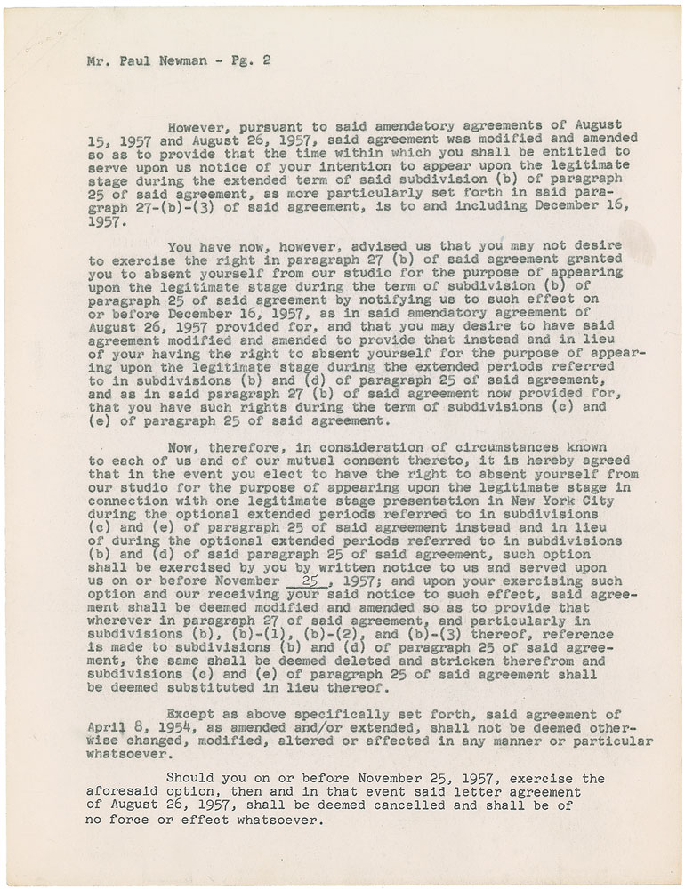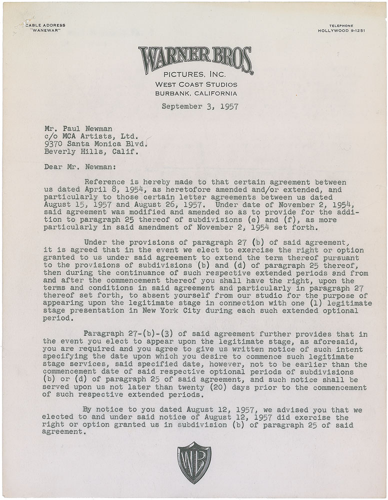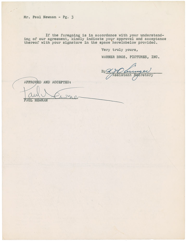 DS, three pages, 8.5 x 11, September 3, 1957. Document in which Warner Bros. grants Newman “the right to absent yourself from our studio for the purpose of appearing upon the legitimate stage in connection with one legitimate stage presentation in New York City.” Signed at the conclusion in ballpoint by Newman and countersigned by a secretary. In fine condition, with expected document wear. Accompanied by a full letter of authenticity from PSA/DNA. This document dates to the period between two of Newman’s biggest hits, Somebody Up There Likes Me and Cat on a Hot Tin Roof. Pre-certified PSA/DNA.