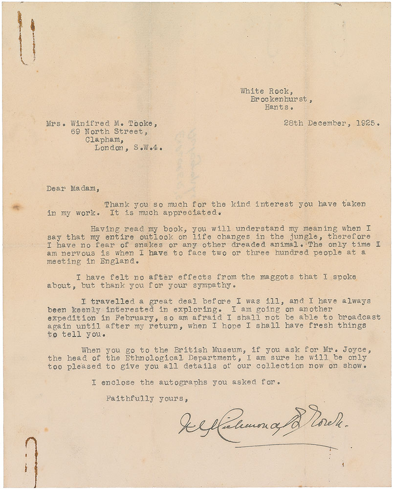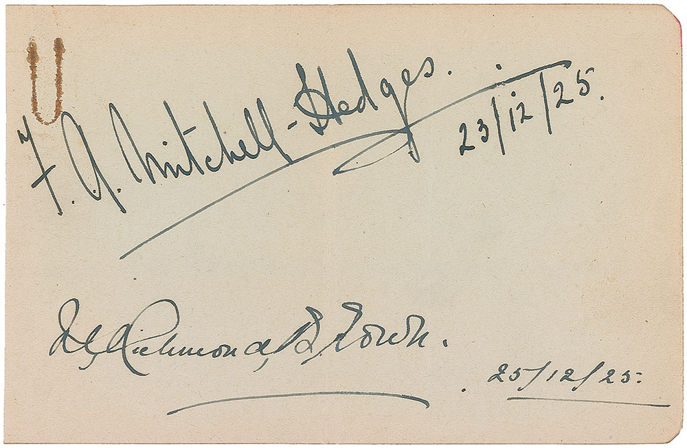 English adventurer, traveler, and writer (1882–1959) known for his discovery of the legendary ‘Crystal Skull.’ Fountain pen signature, “F. A. Mitchell-Hedges, 23/12/25,” on an off-white 6 x 4 album page, also signed by Lady Lillian Richmond Brown. A rusty paperclip mark to the upper left, otherwise fine condition. Also includes a 1925 TLS by Lady Richmond Brown, who was an early woman explorer and traveling companion of Mitchell-Hedges. Pre-certified PSA/DNA.