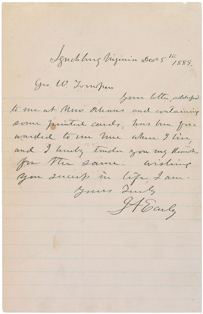 ALS signed “J. A. Early,” one page, 5.75 x 9, December 5, 1889. Letter to a gentleman. In part: “Your letter, addressed to me at New Orleans and containing some printed cards, has been forwarded to me where I live, and I hereby tender you my return for the same.” Central vertical and horizontal folds and a couple small stains, otherwise fine condition. Pre-certified PSA/DNA.