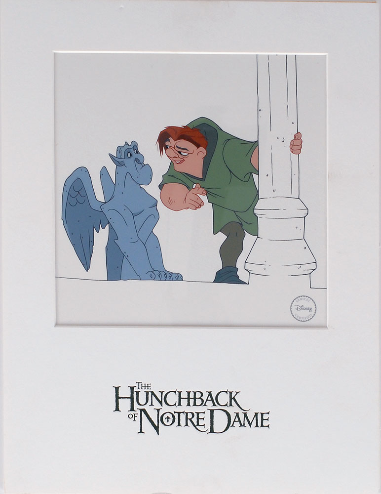 (Walt Disney Studios, 1996) Sericel featuring Quasimodo from The Hunchback of Notre Dame. Image measures 6.5 x 6, with a mat opening of 7 x 7. Mat dimensions are 9.5 x 12.5. The piece has the silver Walt Disney Company seal to lower right. In fine condition.