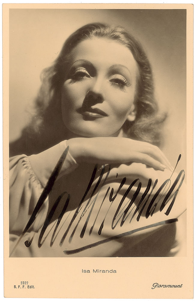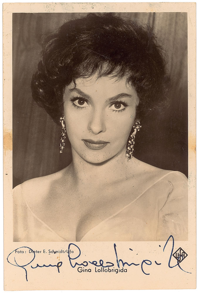 Two vintage photo postcards of Isa Miranda and Gina Lollobrigida, each approximately 3.5 x 5.5, individually signed in black or blue ink by the actress pictured. The Miranda postcard is in fine condition, with slight silvering to dark areas of the image; toning to vertical edges, slight writing impressions, and mounting remnants to reverse of the Lollobrigida, otherwise fine condition. Pre-certified PSA/DNA.