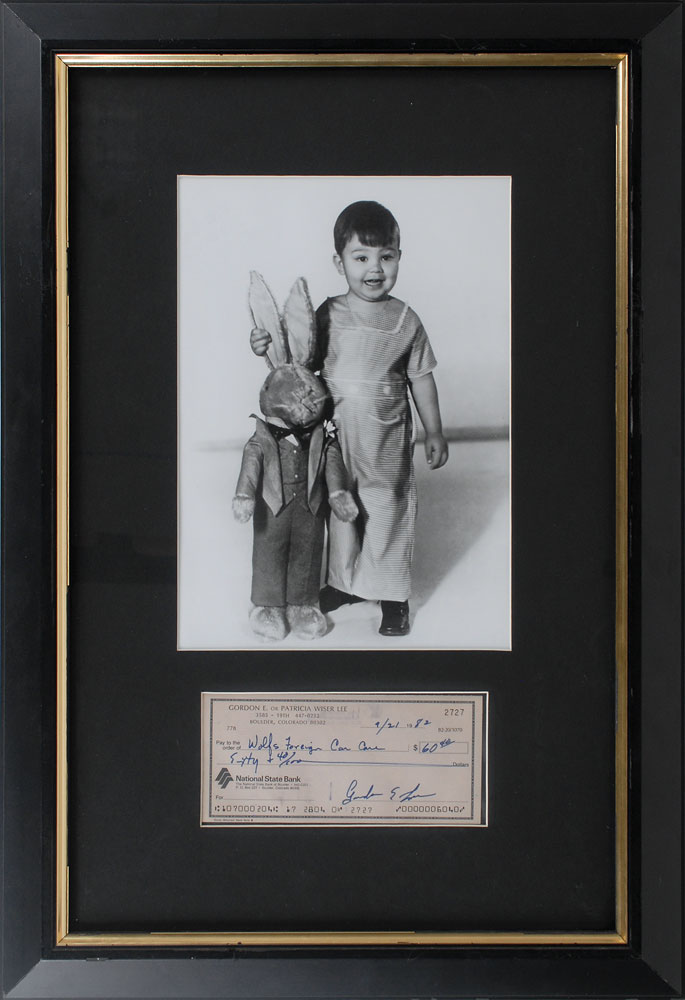 Personal check, 6 x 2.75, filled out and signed by Lee, “Gordon E. Lee,” payable to Wolf’s Foreign Car Care for $60.40, September 21, 1982. Matted and framed with a photo of Porky holding a stuffed rabbit to an overall size of 14.75 x 21.5. In fine condition, with slight show-through from expected bank stamps to reverse. Pre-certified PSA/DNA.