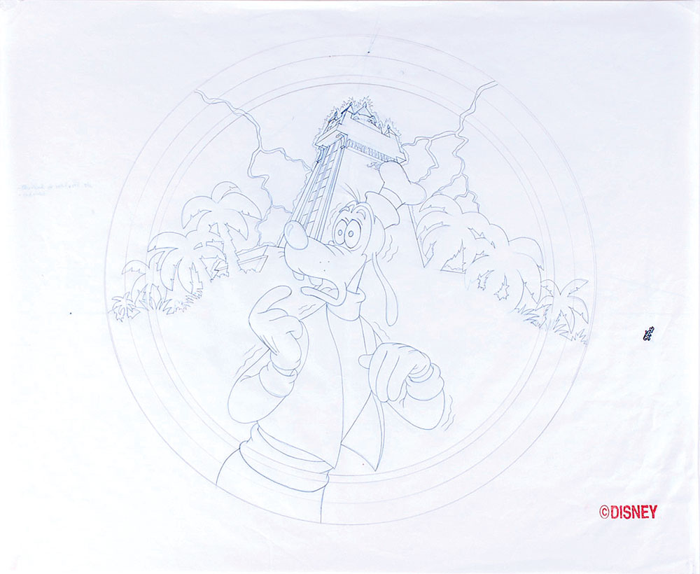 (Walt Disney Studios, 1994) Original merchandising production drawing featuring Goofy in front of Disney World’s Tower of Terror, drawn by Jim Story for the celebration of the amusement park’s 23rd birthday. Accomplished in graphite and colored pencil on 17 x 14 illustration paper. Character image measures 5.5 x 9, with a total image size of 11.5 x 11. In fine condition.