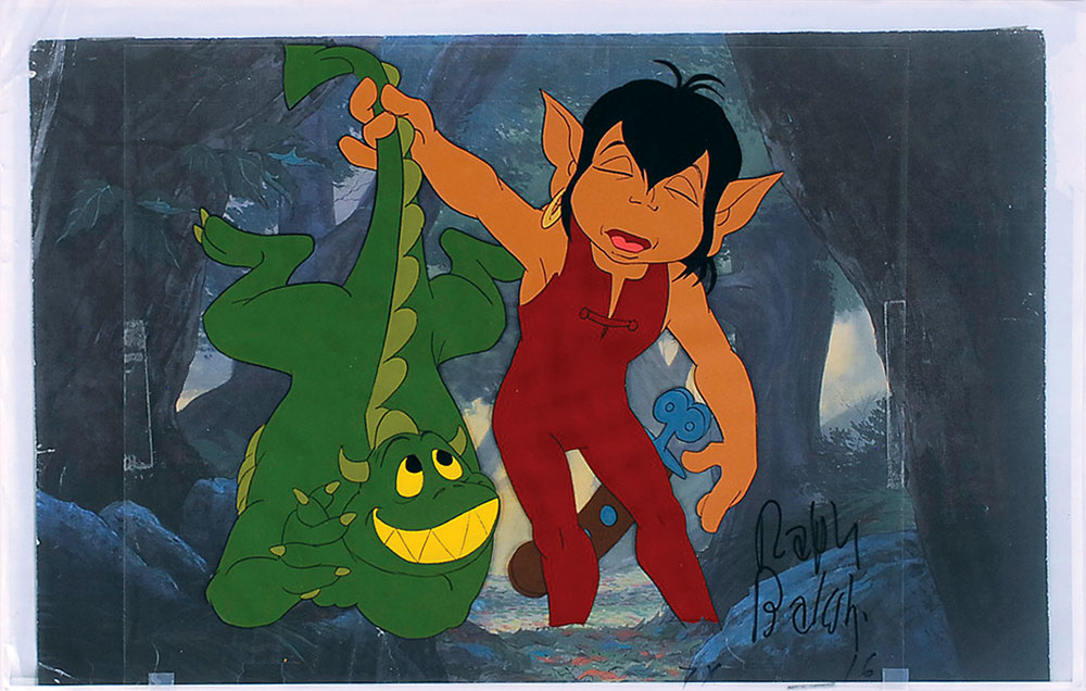 (Ralph Bakshi Productions, 1977) Original production cel from the cult classic Wizards, showing Weehawk holding a reptile by its tail, signed in black felt tip by director Ralph Bakshi. The cel is slightly trimmed to 12.25 x 10.25 and placed on a color copy background. Image measures 8.75 x 9.25, with overall dimensions of 17 x 11. Cuts and missing plastic to oblong registration holes, tape remnants to vertical edges, and a small tear and creasing to background, otherwise fine condition. Pre-certified PSA/DNA.