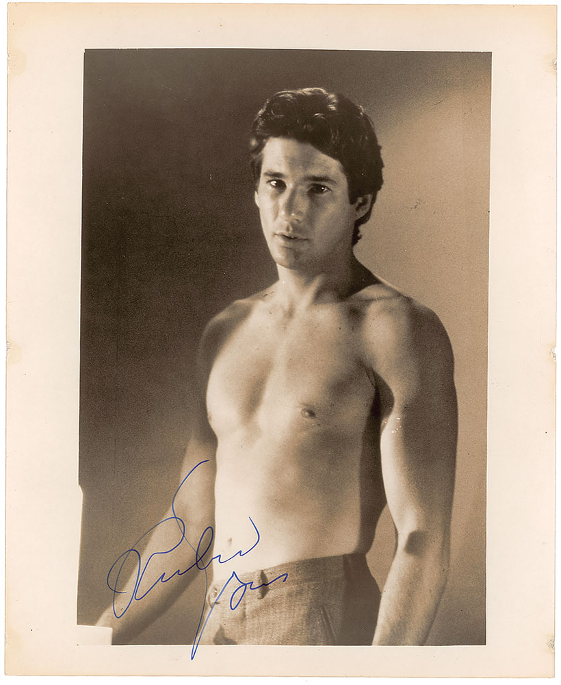 Glossy 8 x 9.75 half-length photo of a shirtless Gere during his modeling days, signed in blue ink. In fine condition, with dings and slight toning to edges which could be easily matted out. Pre-certified PSA/DNA.