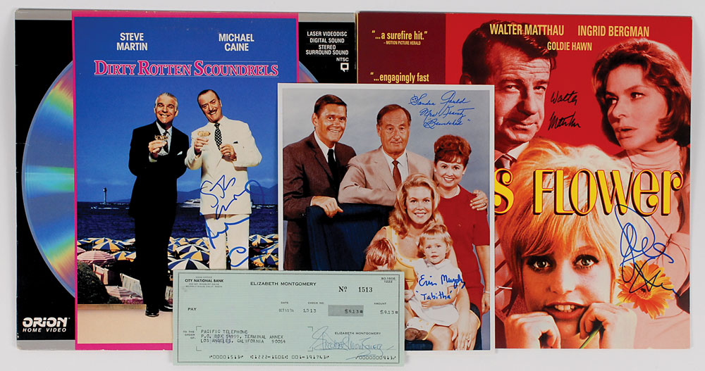 Collection of four items, each signed by a comedian or actor, including: a color glossy 8 x 10 photo of the cast of Bewitched, signed in blue felt tip by Sandra Gould and Erin Murphy, both adding their character names; a personal check, 8.5 x 3.5, filled out in type and signed by Elizabeth Montgomery, payable to Pacific Telephone for $9.13, October 10, 1974; a Cactus Flower laser disc, signed in person on the front cover in blue felt tip by Walter Matthau and Goldie Hawn; and a Dirty Rotten Scoundrels laser disc, signed in person on the front cover in blue felt tip by Steve Martin and John Cleese. In overall fine condition, with slight edgewear to the laser discs, and expected bank stamps and two tape-repaired tears to the check. The discs are not included. Pre-certified PSA/DNA.