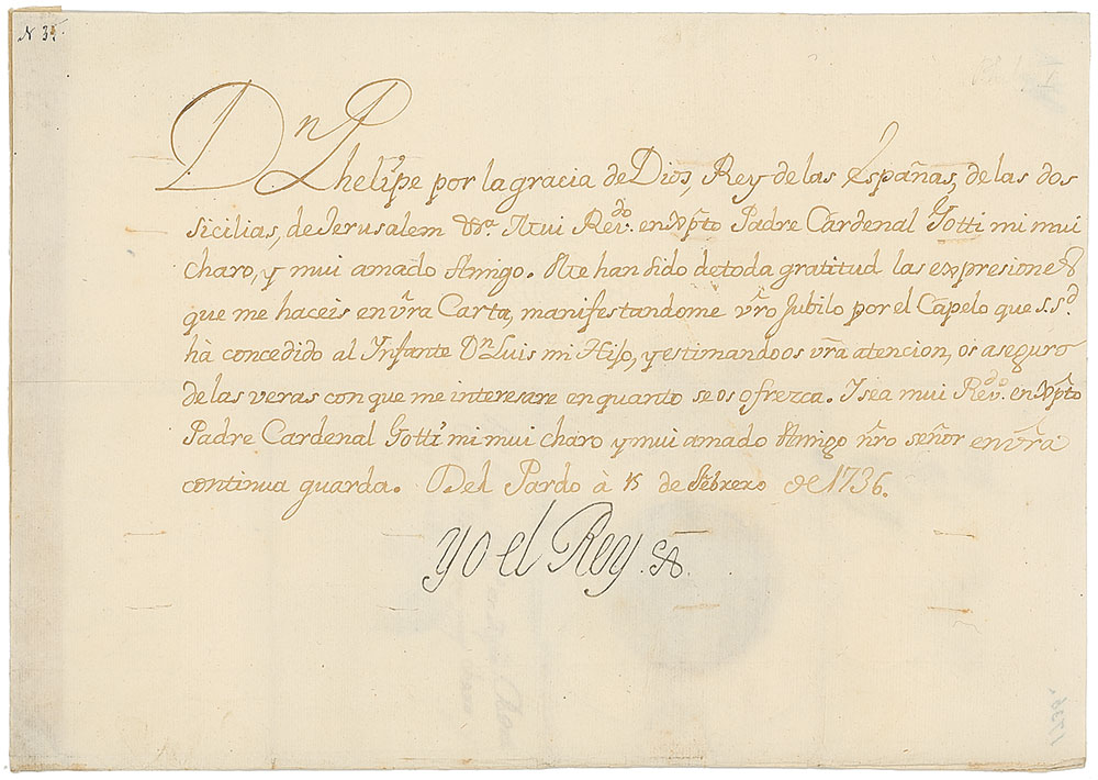 Grandson of King Louis XIV whose accession to the Spanish throne prompted the fourteen-year long War of Spanish Succession (1683–1746). Manuscript DS in Spanish, signed “Yo el Rey,” one page, 11.5 x 8, February 15, 1736. Untranslated document mentioning Vincent Cardinal Gotti. Crisply signed at the conclusion by King Philip and countersigned by Secretary of State Jose Patino. The crisply embossed paper seal affixed to the reverse remains fully intact. In fine condition, with expected document wear and a few tiny tears. Pre-certified PSA/DNA.