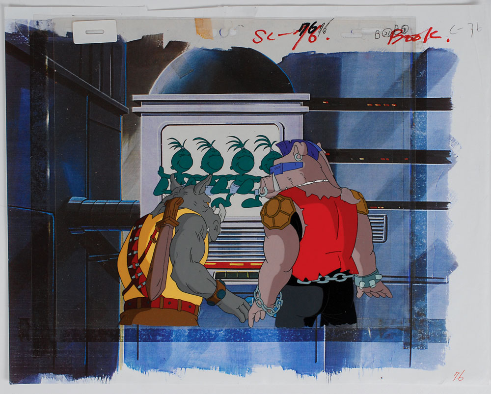(Murakami-Wolf-Swenson, 1987) Four original hand-painted production cels for Teenage Mutant Ninja Turtles with character images measuring from 2.5 x 3 to 5 x 6.5, all set against color 14 x 11 pre-printed backgrounds. Cels depict: Michelangelo, ?Leonardo, ?Donatello, Rafael, and April; Rafael, Michelangelo, and Irma Langinstein; Bebop and Rocksteady; and ?Donatello. In overall fine condition.