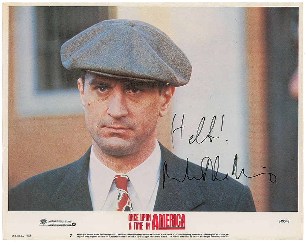 Attractive color lobby card for the 1984 film Once Upon a Time in America, 14 x 11, signed in black felt tip, “Hello! Robert DeNiro.” In fine condition, with trivial edgewear. Pre-certified PSA/DNA.
