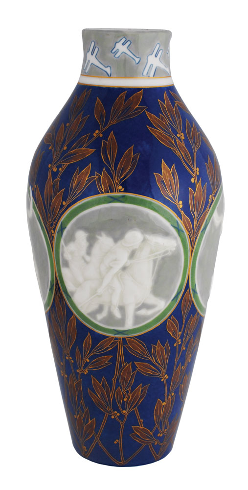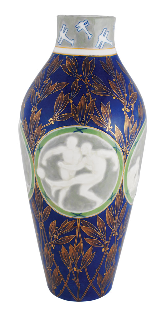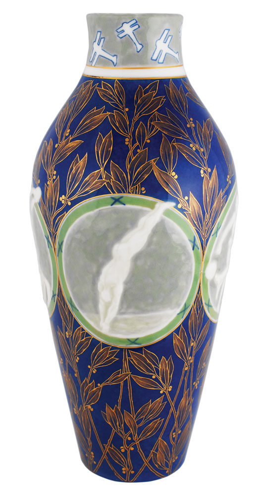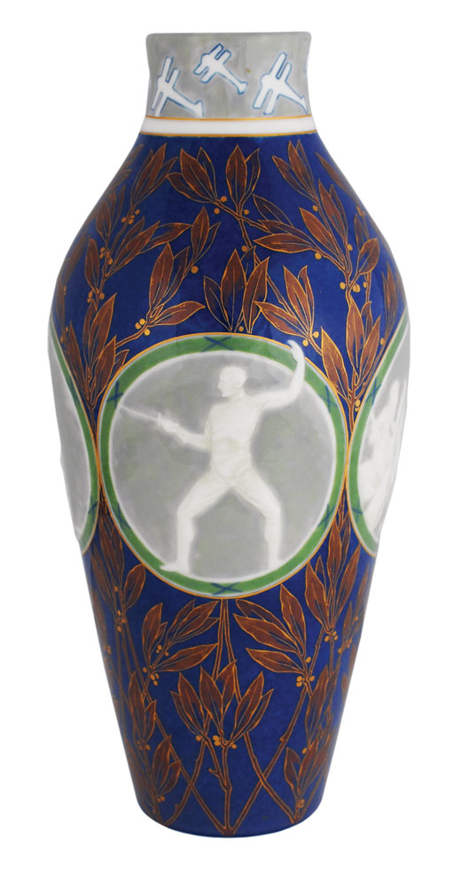 At the suggestion of the French Olympic Committee, these vases were developed to be given to the first place winners as a ‘special souvenir.’ Several different variations were produced to accommodate the many different sports, and they were presented by the Paris City Council to gold medal winners in individual events only. Surviving examples of these stunning trophy vases are of the utmost rarity and hardly ever offered in pairs.