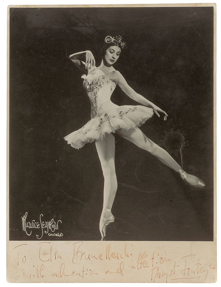 Lovely vintage matte-finish 6.25 x 8.25 full-length photo of Fonteyn by Maurice Seymour of Chicago, signed and inscribed in the lower border in black ink, “To Elsa Brunelleschi, with admiration and affection, Margot Fonteyn.” In very good condition, with scattered soiling and creasing (one crease touching the first letter of the signature), and some smudging and fading to portions of the inscription and signature. Pre-certified PSA/DNA.