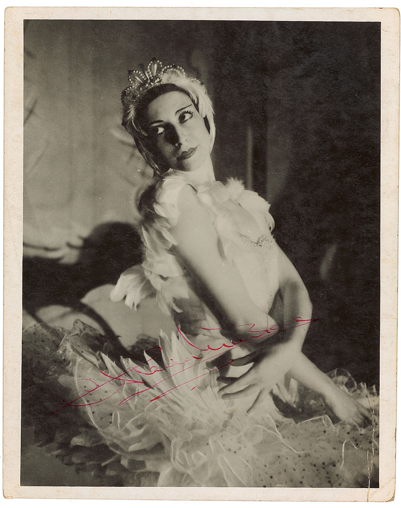 English ballerina and choreographer (1910–2004). Beautiful vintage semi-glossy 8 x 10 photo of Markova in a feather-backed costume and tutu, signed in red fountain pen. Some wear and toning to edges, slight silvering to dark areas of the image (visible only at an angle), and a crease and small tear to lower left corner, otherwise fine condition. Pre-certified PSA/DNA.