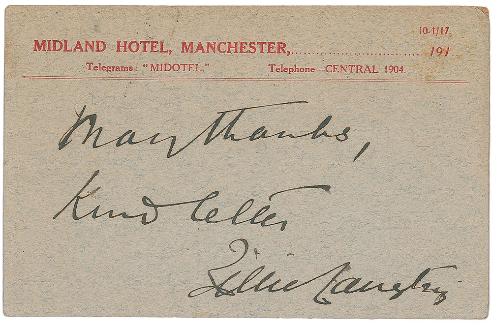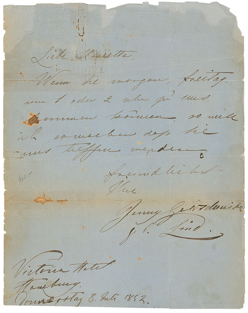 Two items: an ink signature, “Many thanks, kind letter, Lillie Langtry,” on an off-white 5.5 x 3.5 postcard from the Midland Hotel in Manchester, postmarked November 6, 1917; and an untranslated ALS in German, signed “Jenny Goldschmidt Lind,” one onionskin page, 8.25 x 10.5, July 8, 1852. In overall very good condition, with irregular ink adhesion and trivial brushing to portions of the inscription and signature, and slight toning and wear to edges to the Langtry signature, and partial separations to intersecting folds (a horizontal fold passing just above the signature), several tears and small areas of paper loss (affecting a couple letters in her surname), and scattered staining and creasing to the Lind letter. Pre-certified PSA/DNA.