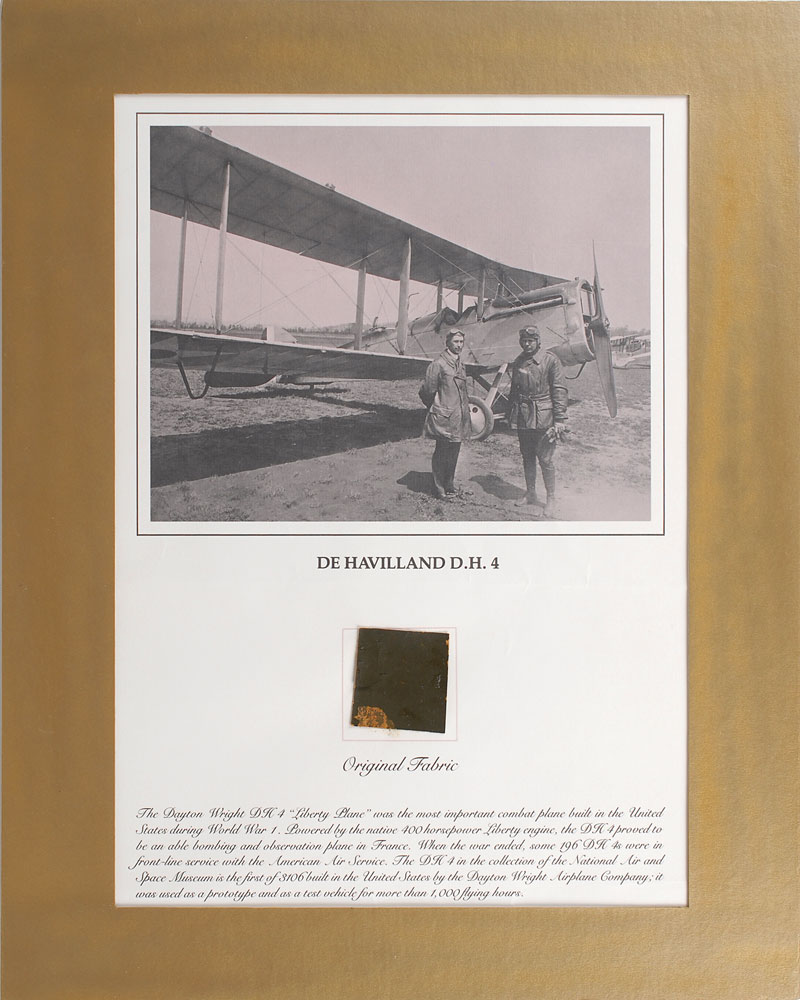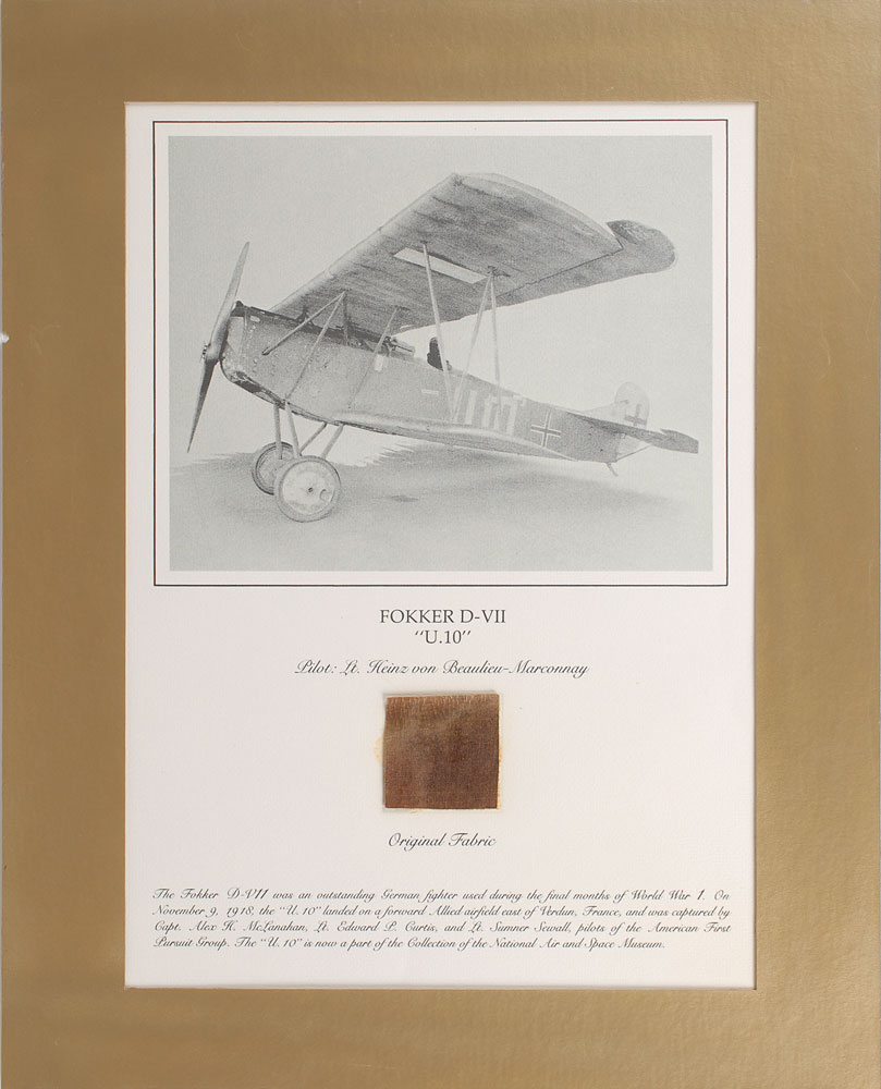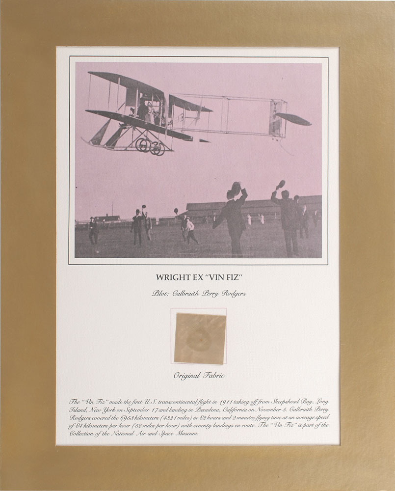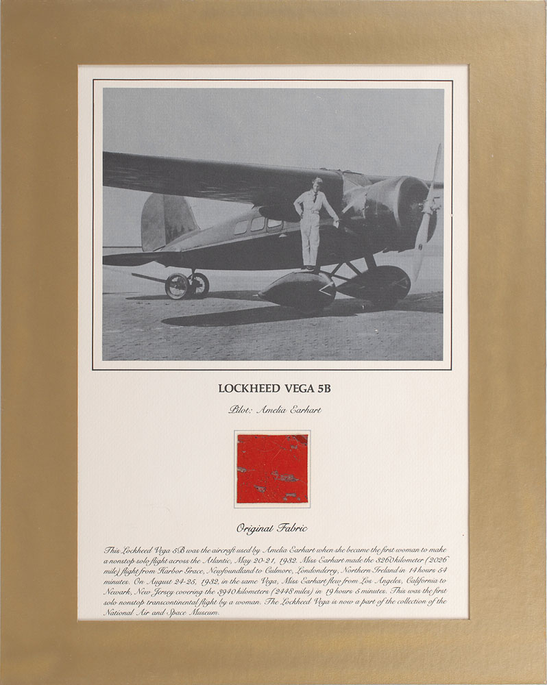 Complete set of the nine flown fabric presentations created by the Smithsonian Institution National Air and Space Museum with fabric removed during restoration of historically important aircraft. Each swatch measures about 2 x 2 and is affixed to an informational poster and matted to an overall size of 16 x 20. Pieces include: a brown swatch from Calbraith Perry Rodgers’s Wright Brothers Vin Fiz; a bright red swatch from Amelia Earhart’s Lockheed Vega 5B; a dark brown swatch from from Oakley Kelly and John Macready’s Fokker T-2; a beige swatch from the Bleriot XI; a dark brown swatch from the Douglas World Cruiser ‘Chicago’ that made the first around-the-world flight in 1924; a dark brown swatch from Lt. Heinz von Beaulieu-Marconnay’s Fokker D-VII ‘U.10’; a gray swatch from the Albatros D.Va No. 7161/17; a brown swatch from the Curtiss NC-4 Flying Boat that made the first transatlantic flight in 1919; and a dark gray swatch from the De Havilland DH-4 WWI bomber. A crease to the center of the De Havilland DH-4 sheet and toned adhesive affecting the appearance of the Albatros D.Va sheet, otherwise overall fine condition. Rarely offered as a complete set, this is an absolutely remarkable collection of relics from some of the most important aircraft in aviation history.